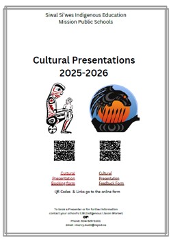 Siwal Si'wes is pleased to offer cultural presentations for educators throughout the district, from October to May of each school year. Most of these presentations are free! Please click on the link below for the 2025 2026 Cultural Presentation catalogue.